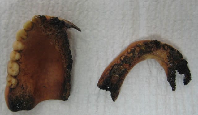 J'en ai vu du même genre, mais je n'ai pas pu les refaire, le patient lui même était carbonisé...(identification suite à accident de la route...)