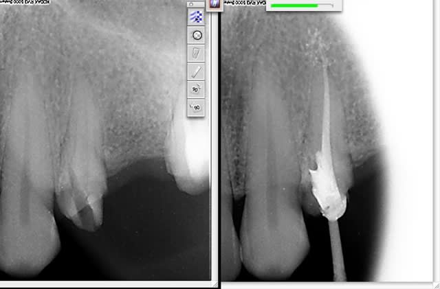 Je me suis un peu precipiter et me voici avec une perforation mésiale sur une 24 à environ 3,5mm du collet. Heureusement, j'ai réussi à recuperer l'axe et je vous presente la perf puis l'obturation canalaire qui a suivi.