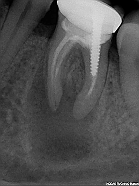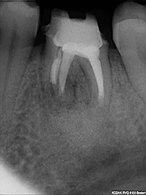 Bien que j'apprécie la prouesse technique de marc (cf. sa radio), il me semble que le meilleur service à rendre sur le long terme au patient est de lui virer cette dent et de poser un implant.