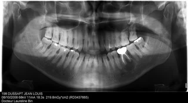 Même si cela doit être long, même si l'image est impressionante (parce que le problème ancien, tout simplement), vu le reste de la denture, le patient a tout à gagner dans une tentative pour lui sauver la seule dent qui lui a posé problème.