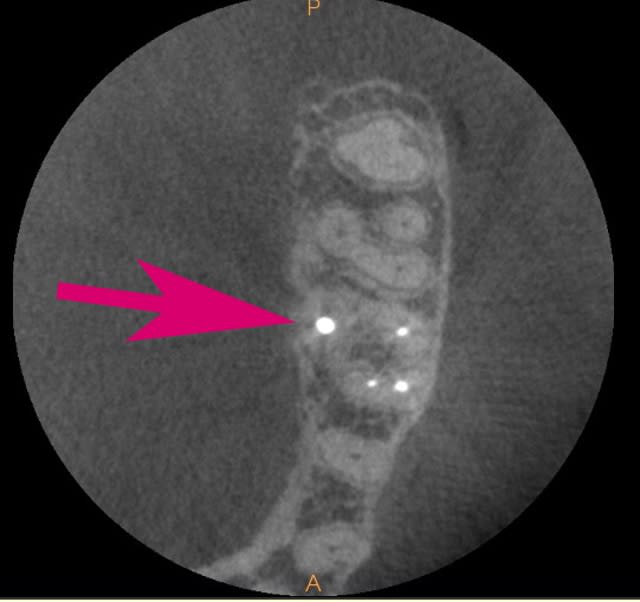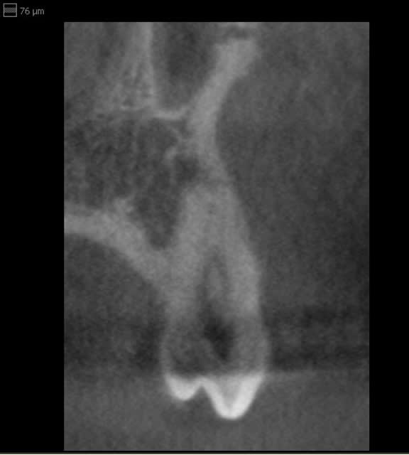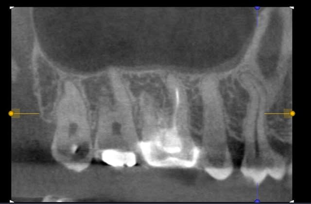 Il ya encore un souci d'artéfact important quand il y a un fort contraste exemple obturation endo très dense ou tenon métallique ((flèche sur image jointe).