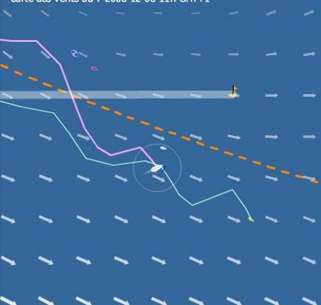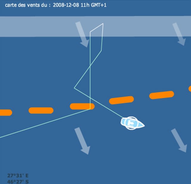 en regardant ce matin, j'ai encore progressé au classement malgré mon cap de croisière , ne suis plus qu'à 179 miles de cingulum (normal mon cap m'a rapproché de l'orthodromie)alors que Cingulum qui reste en course plus que jamais a pris la bonne option , un peu sud pour rester accroché et profiter de la dépression.