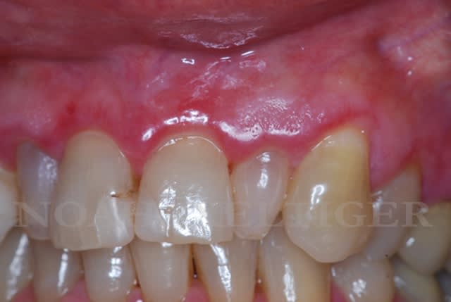 ou alors c'est une "simple" gingivite desquamative post ménopausique (en raison d'une grande ressemblance histologique et immunologique avec la pemphigoïde cicatricielle certains auteurs avancent l'idée qu'elle ne serait qu'une variante limitée à la gencive adhérente de cette pemphigoïde)avec un nouveau compagnon sexuellement trés actif...