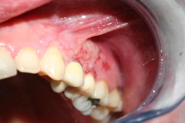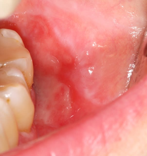 D'emblée je pense pas à un truc de malade mais plutôt à des traumatismes locaux faits par le patiente lui-même avec une brosse à dent toute pourrie avec des poils pliés et des problèmes d'hygiène de départ suite à fatigue ou soirée alcoolisée ou les muqueuses sont parfois très fragiles.