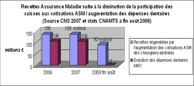 En effet, les chiffres publiés des dépenses dentaires pour les années 2005, 2006 et 2007, ainsi que le prévisionnel 2008 (statistiques mensuelles de la CNAMTS), montrent que l’accord conventionnel a été largement favorable aux Caisses. Les recettes engendrées par l’augmentation de la cotisation des chirurgiens-dentistes ont été nettement supérieures aux dépenses d’assurance maladie induites par les revalorisations tarifaires des actes conservateurs et préventifs.