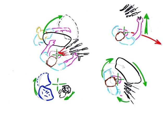 C'est le concept que défend mon ami Oene Hokwerda. Mais je ne suis d'accord qu'avec certains de ses points de vue. En particulier, il estime que la position à midi n'est pas favorable à une bonne position de l'assistante et des autres éléments de l'unit pour une préhension sans problème. Il préfère celle à 11 heures comme point de départ pour tout, sans s'interdire de se déplacer à droite où à gauche de cette position. Personnellement, c'est ce que j'essaye de faire. Il me semble que les autres positions ne le sont que pour de cours instants et ne nécessitent pas une réajustement à chaque fois de l'unit. Je vais voir ça en travaillant pour mieux me rendre compte si c'est le cas ou non.