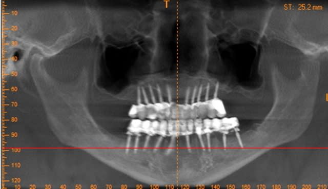Je réalise l'ensemble, guide chirurgical de forage, positionneur d'implants et armature du provisoire à partir des images native DICON du scanner. Dans ce cas la chirurgie et la mise en fonction de la prothèse transitoire ont été effectuées en une opération.