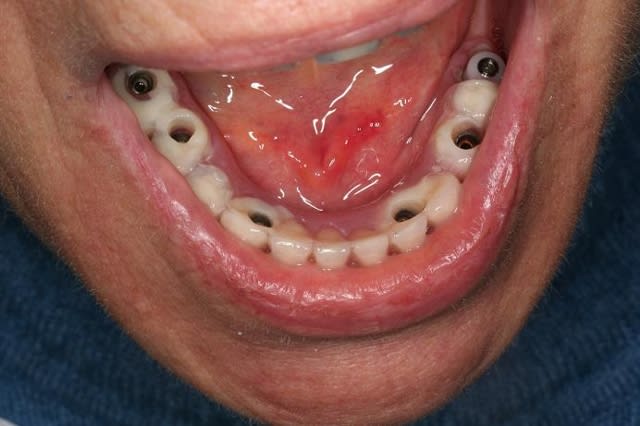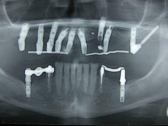dans le style exotique..certes pas de MCI mais pas mal quand même.... adressé par un ami un peu dépassé par le cas qui se présentait... le travail était bien entendu la prothèse définitive... et de l'amalgame réunit les deux implants extrêmes...
