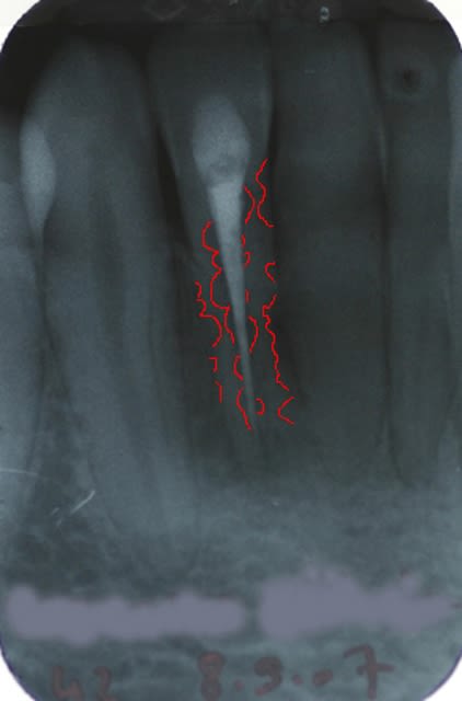 J'ai retraité la 42 en octobre 2007. Cette dent avait subi un traumatisme il y a une dizaine d'année. A la radio de contrôle d'hier, il semble qu'une resorption se soit développée en mésial, au niveau cervical en regard de la chambre.