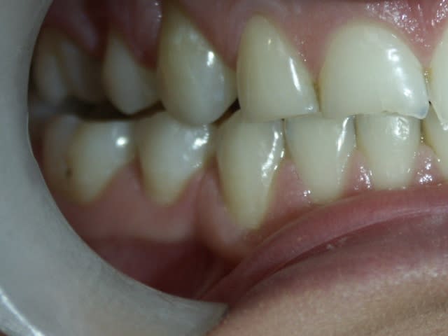 Les molaires sont en partie en inocclusion, en particulier les 15-16/45/46, et légèrement côté G. Pas de douleur à l'ATM.