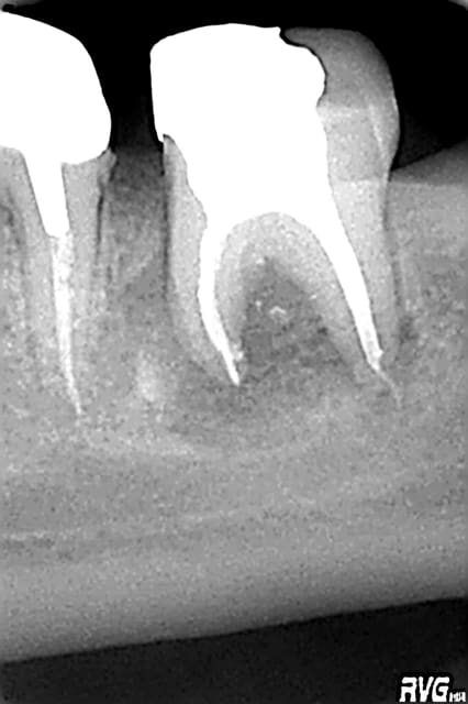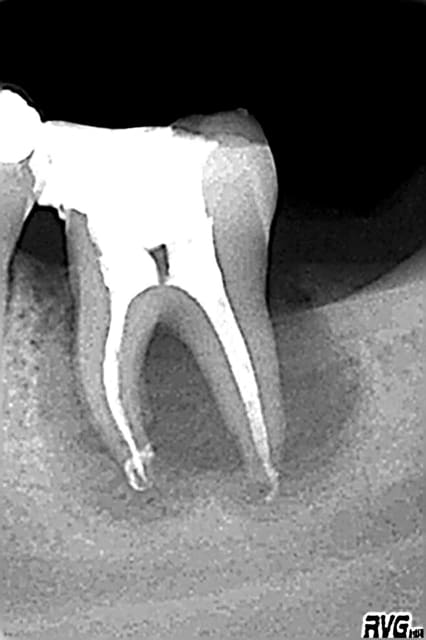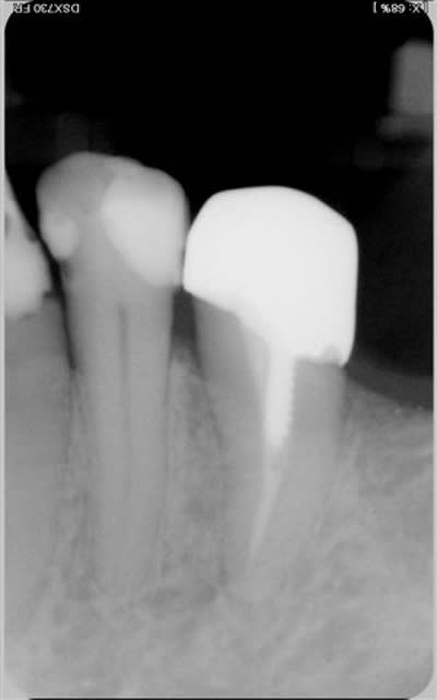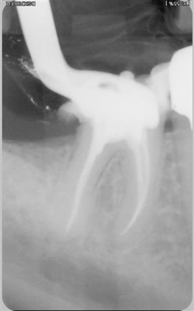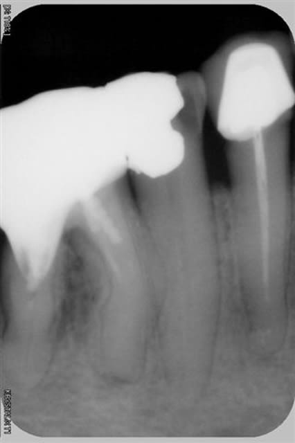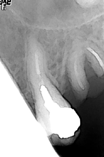 Non loin de là. Avant de commencer tout traitement j'ai juste l'habitude de poser un diagnostic et un pronostic. Je trouve dans ce cas qu'il est abérrant de faire croire au patient que la dent peut être traitée avec un bon pronostic. Dans un cas pareil, même si le patient insiste, je me refuse de conserver la dent. L'expérience clinique c'est toi qui l'a, pas le patient !! Il faut arrêter de réver !!