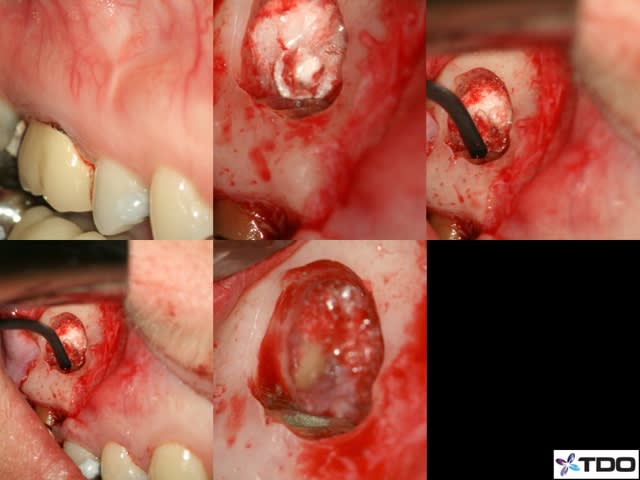 Comme tu as fait un super boulot en endo, autant faire le max en paro maintenant. Il conviendrait de saquer la 48 mésioversée et lors de cette chir décoller un peu en antérieur, surfacer la racine distale et la zone inter radiculaire de la 46. Pas de matériau de comblement car il n'y a plus de paroi osseuse pour le soutenir.