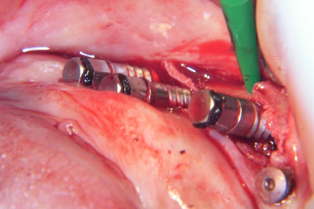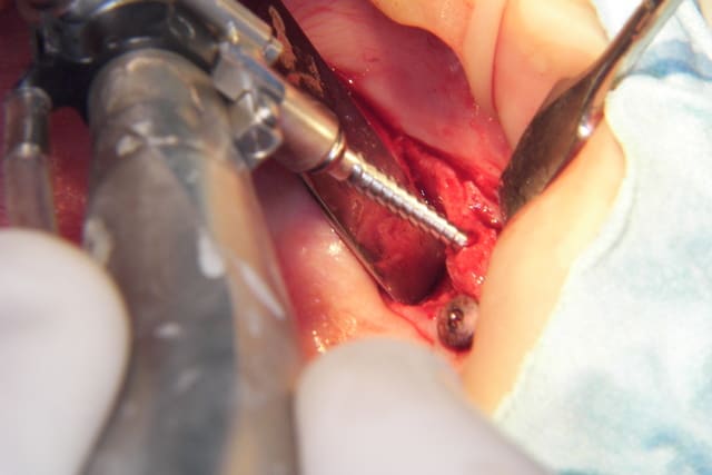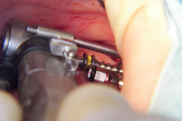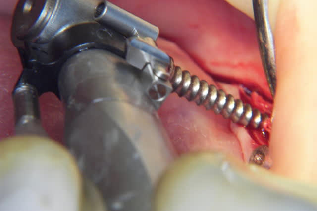 découpe d’une saignée au disque , diamanté, forage des « puits désires avec un foret de 0.7mm pour marquer les emplacements, les incisions de décharges au disque ou au piezo ,(ça dépends si j’ai fait un lambeau large ou incision crestale simple, ensuite mais préférence va au piezo pour approfondir les tranchées, puis mise en place des spreaders dans les puits de 0.7 et en passant de l’un à l’autre la crête s’écarte comme une fleur.