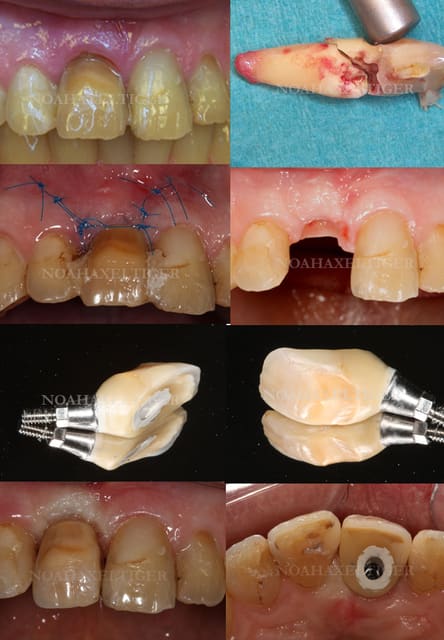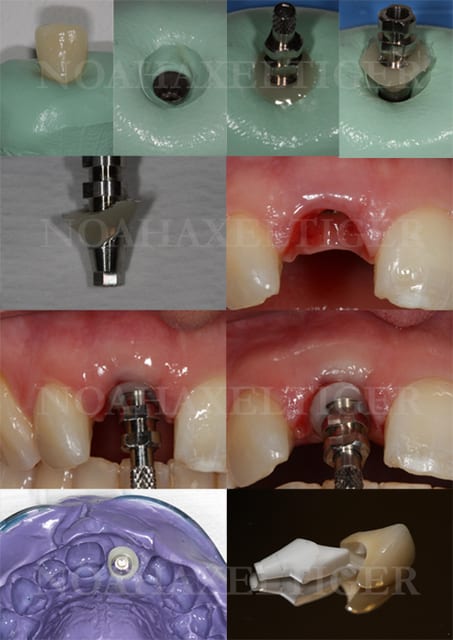 Dans le cas suivant, la dent a été extraite pour cause de résorption et fracture radiculaire. Extraction + mise en place immédiate + GBR + greffe conjonctive. Temporisation peu esthétique où la dent du patient est collée aux dents adjacentes.