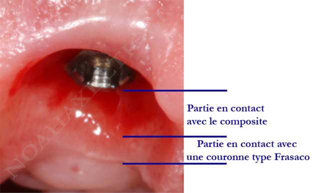Alors pourquoi je ne l'ai pas fait ? J'ai réalisé dans ce cas une greffe conjonctive et j'ai préféré attendre d'obtenir une cicatrisation gingivale superficielle avant de mettre mon pilier temporaire. J'ai en effet remarqué que le composite que l'on utilise pour former nos piliers temporaires entraine toujours une certaine irritation gingivale même avec un polissage méticuleux (voir photo ci jointe). Et j'ai jugé que cette inflammation pouvait compromettre la cicatrisation de mon conjonctif enfoui. Voilà pourquoi.