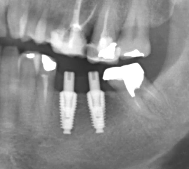 Joli boulot par ailleurs, mais plan de traitement discutable: imaginons qu'en reprenant l'endo de 35 tu casses un instrument: ça flambe et tu decides d'extraire. tu es obligé de mettre un troisieme implant, là ou tu aurais pu n'en mettre que deux.