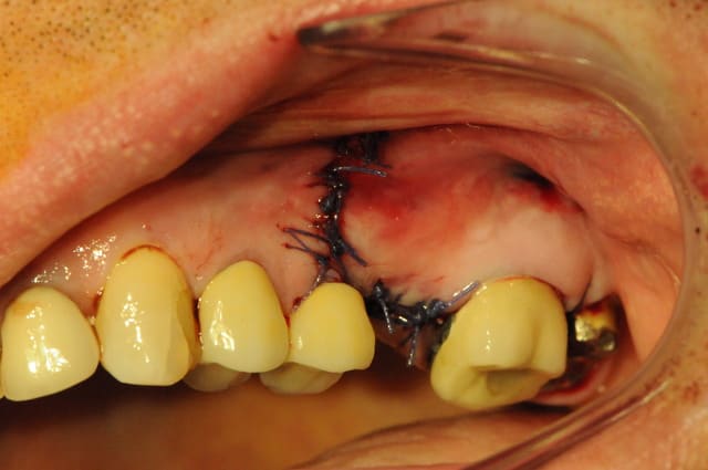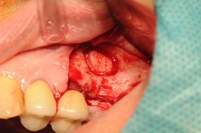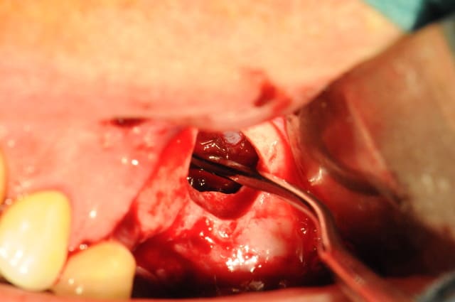 Par rapport aux cas de sinus lift déjà vus, j'ai l'impression que la surface du volet osseux est assez petite (et un peu bas comme dit plus haut) : c'est fonction du volume à combler très localisé, ou tu as décollé en regard mais aussi en arrière du volet ?