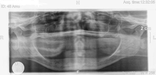 pourrais tu nous en dire en peu plus sur l'anamnèse de cette patiente. A la vue de la téléradio de profil la crête est sacrément résorbée pour une femme de 48 ans!