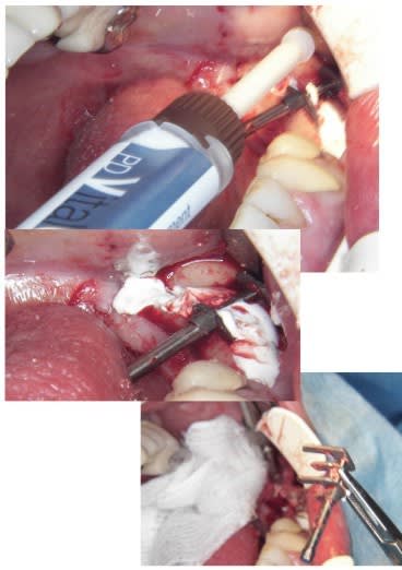 dans le cas présenté, j'ai d'abord mis du perioglass (billes) que j'ai compacté "légèrement" à la compresse+Ostéotome pour "bloquer" la partie osseuse surélevée, puis j'ai mis le VitalOs que j'ai lui aussi "aplani" à la compresse + Ostéotome.