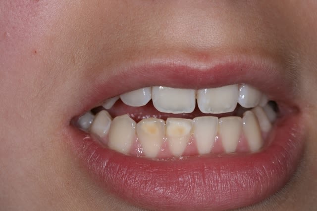 Jeune patiente de 16 ans qui présente 2 grosses tâches d'hypoplasie sur incisives mandibulaires.