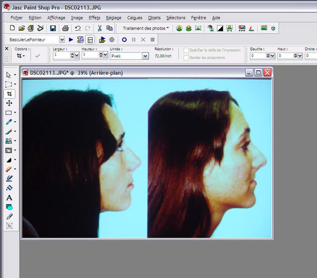 Après cette correction, on effectue un recadrage pour faire disparaître les bords qui apparaissent biseautés et ici supprimer le texte et les ombres des têtes (image P3).