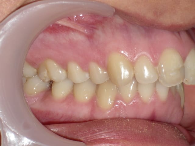 On est coincé ici par la perte de 46 avec déviation des inférieures à droite et la pseudo classe I dentaire à gauche dans ce profil rétrognathe.