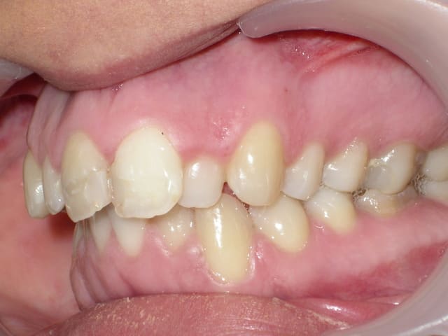 On est coincé ici par la perte de 46 avec déviation des inférieures à droite et la pseudo classe I dentaire à gauche dans ce profil rétrognathe.