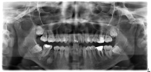 On est coincé ici par la perte de 46 avec déviation des inférieures à droite et la pseudo classe I dentaire à gauche dans ce profil rétrognathe.