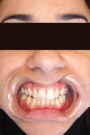 Sur photo de face, on constate un "décentrage" d'une dent complète. La patiente est en occlusion.