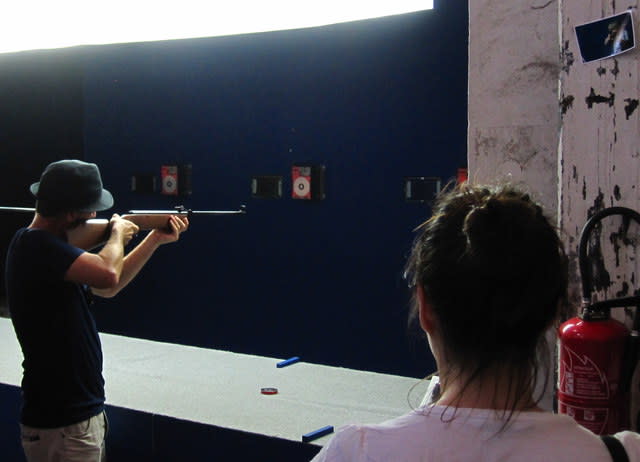 Depuis des célébrités épaulant (dont Cocteau!!), jusqu'au montage permettant de se photographier en déclenchant par un tir à la cible reliée à l'appareil (stand de tir en sortie), en passant par une installation vidéo ne manquant pas de rappeler la méthode de désaccoutumance développée dans Orange Mécanique, entre 4 écrans et son à l'unisson...