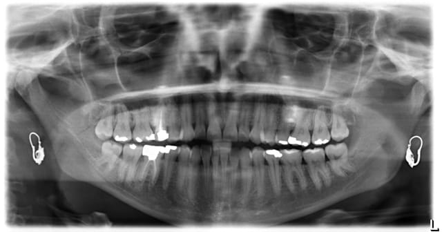 on notera egalement de face une déviation de la pointe du menton vers la gauche.