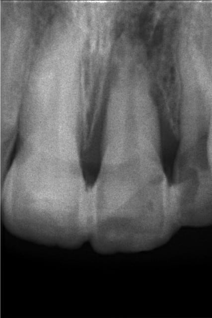 Hier j'ai donc ouvert la dent et nettoyé irrigué. La radio est de mauvaise qualité mais on voit qd même une bonne lésion apicale et une cratérisation de l'os alvéolaire ainsi que , il me semble, des résorptions internes et externes.