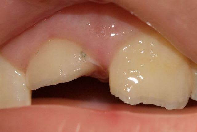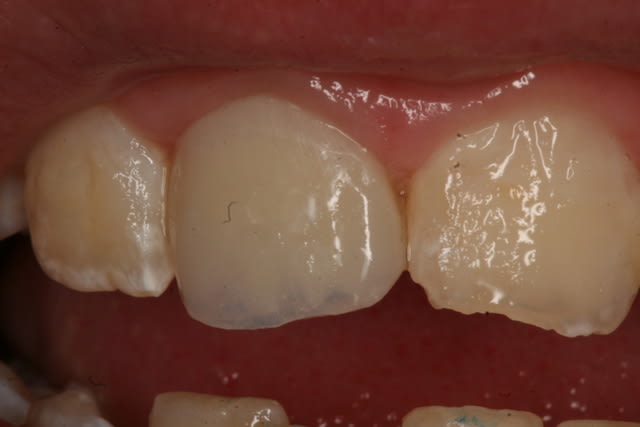 C'est un cas spécial : une ado de 11 ans, chute de vélo avec fracture coronaire de 11 sur les 3 faces (cf photo le jour de la chute). J'ai tenté 2 composites qui n'ont pas tenu. Là le truc a l'air de tenir, même si j'ai de très gros doutes sur la rétention. Après préparation minimale, c'est collé au SmartCem2 (un automordançant, on tente avec ce qu'on a au cab mais le mieux serait un collage au Variolink).