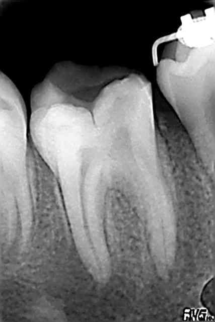 Marie, 13 ans, je vous passe les antécédents sur cette dent, mais toujours est-il qu'elle se pointe en Juillet avec douleurs lancinantes sect IV, aucune vitalité de la 46, tu m'étonnes Elton ce n'est qu'un cratère. (image 01, celle du centre)