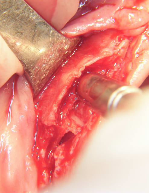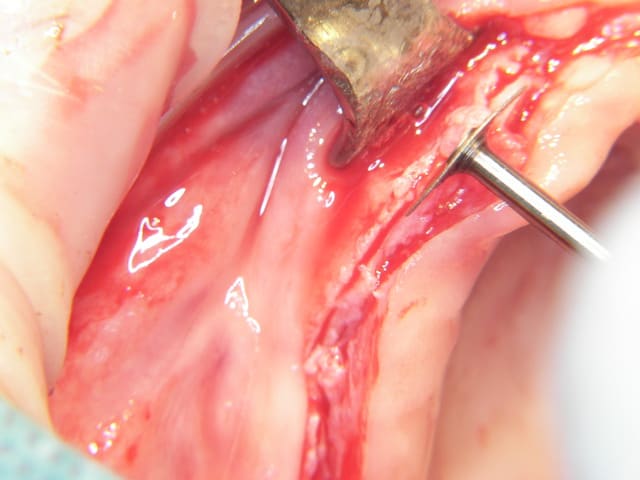 > Pxav, l’expansion a été faite après une fente longitudinale en crestal et horizontale en vestibulaire, l’outil de TATUM utilisé avec le méplat en palatin et le côté arrondi expanseur en vestibulaire.