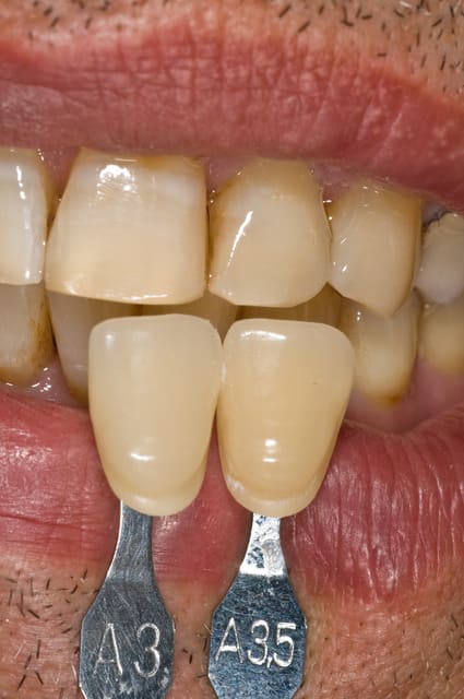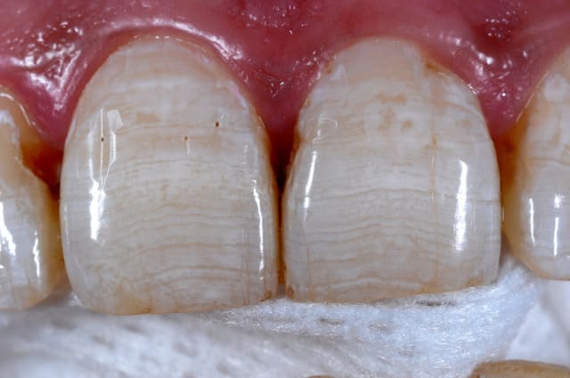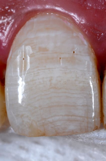 - un bon outil en photo macro intraorale (en vue de présentation par exemple) est l'utilisation de contrasteur photo, comme sur les photos suivantes. Ils augmentent le contraste et soulignent les détails (translucidité amélaire,...) en isolant visuellement l’arrière plan. (en placant derrière les dents à photographier un plan noir). C'est outil doit malgré tout être utilisé avec précaution si on se sert des photos pour transmettre une teinte au labo !