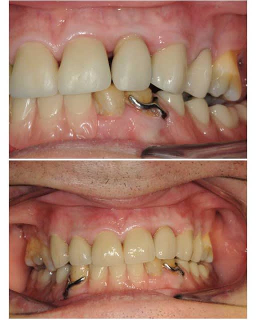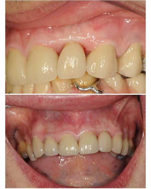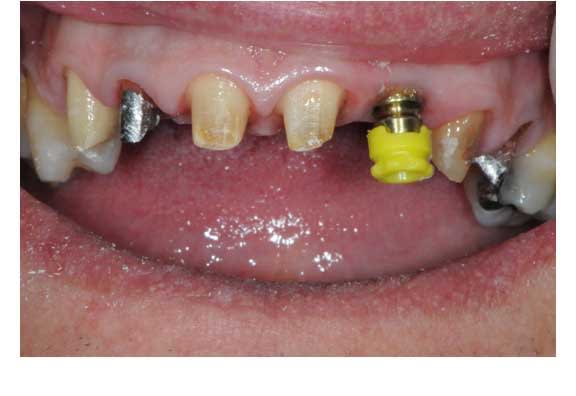 Un cas comme celui ci peut etre selon moi aussi traité par un bridge.Pourquoi as tu choisi cette solution(implantation +bridge+chir muccoging)?