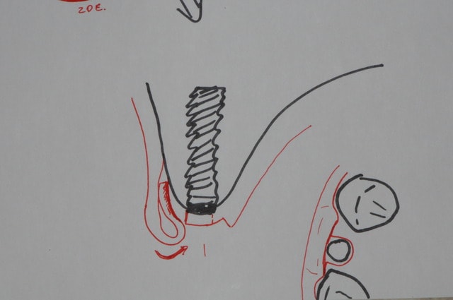 En effet, on dirait que tu as fait une sorte de conjonctif enfoui inséré en vestibulaire avec prélèvement sur la crête. Aurais-tu fait l'incision crestale vestibulaire pour voir l'implant en vestibulaire avant de poursuivre ? ou y a-t-il une autre raison ?