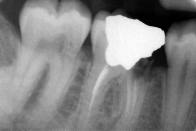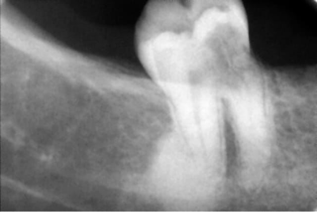 IL y a une résorption peut être externe au niveau cervical mésial, et une pulpite chronique qui provoque une ostéite condensante apicale sur la racine distale. Ca fait beaucoup pour pouvoir conserver cette dent dans de bonnes conditions.
