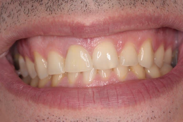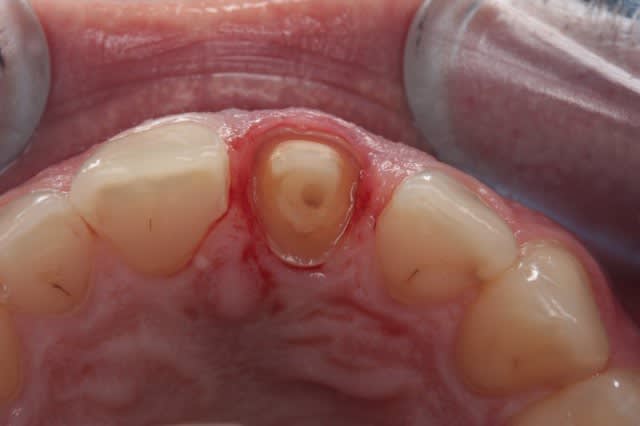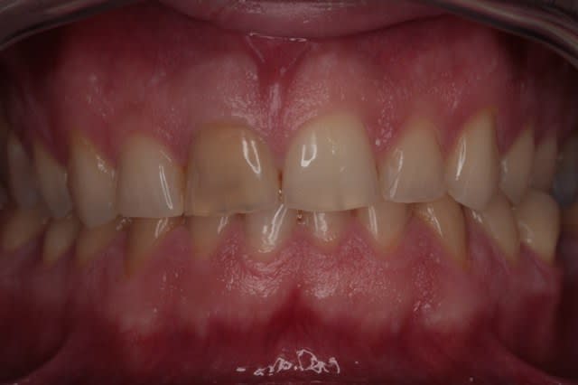 Le problème est la coloration bleutée de la gencive dûe aux racines dévitalisées qui noircissent , mais que faire ??? (seule la 11 semble dévitalisée)