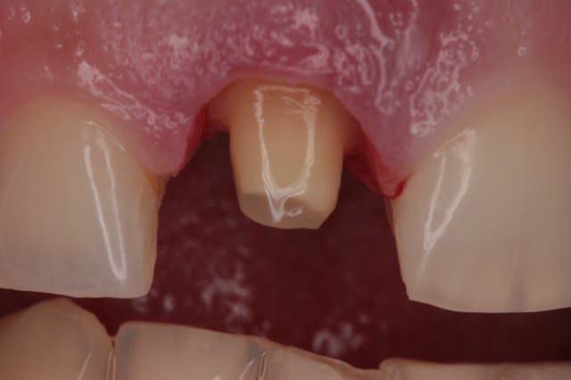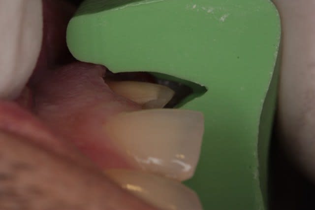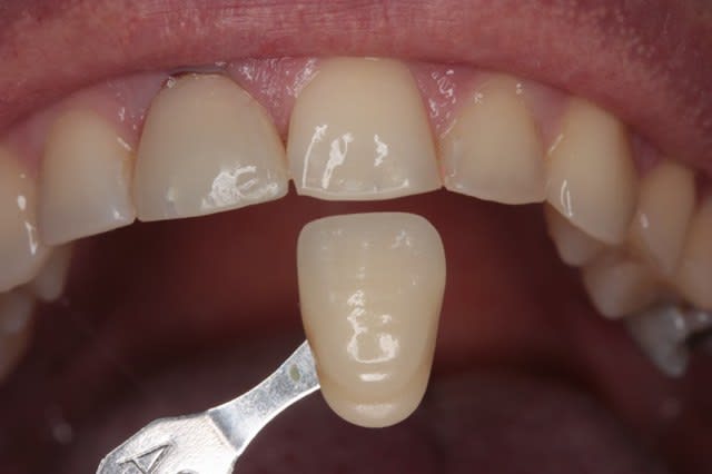 Au départ j'étais pas trop chaud pour la couronne vue la difficuté du cas :contexte occlusal, teinte, exigeances du patient (refaire une incisive centrale isolée ça constitue toujour un enorme défi esthétique, surtout quand c'est le premier cas du genre).