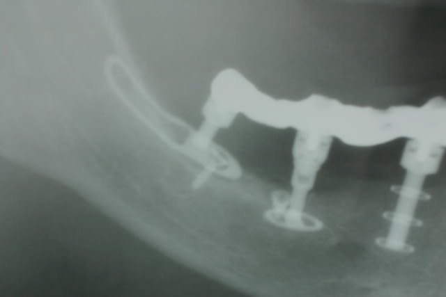 un cas comme celui-ci, je l'aurais traité par 3 implants symphysaires de plus et donc une prothèse transvissée de 10 dents sur 5 implants répartis entre les trous mentonniers.