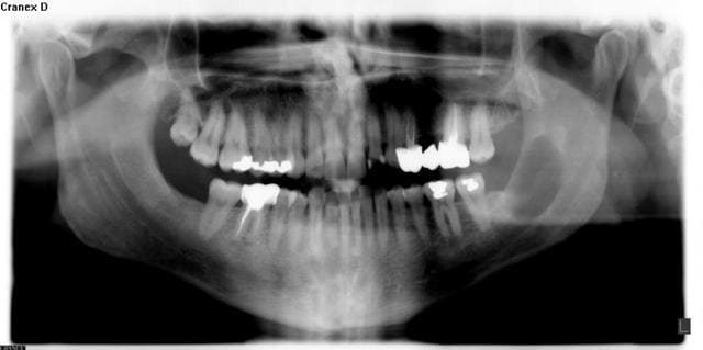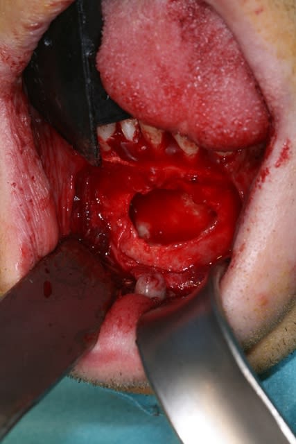 Le kyste que j'ai vu récement était en fait plus étendu : les 2 mentonniers avaient été disséqués. La perte de corticale vestibulaire étaient si importante que le profil de la symphyse était altéré : j'avais été alors étonné de voir le praticien suturer le lambeau sans comblement et/ou membrane.