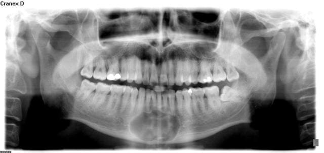 Non c'était un kyste d'origine dentaire à l'apex de 31 qui est lié à une nécrose après trauma 20 ans plus tot.
