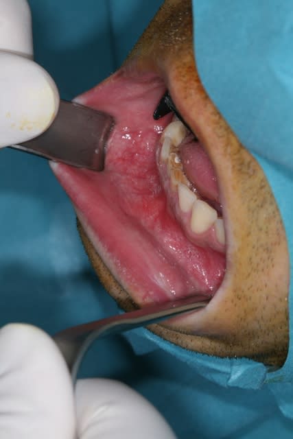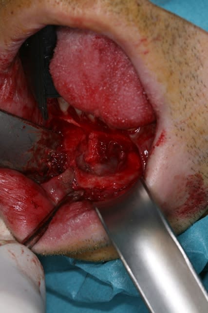 Récemment, j'ai vu un praticien qui pour un kyste similaire au 1er posté a fait un trait d'incision au niveau de la jonction mucco-gingivale, donc sans décoller la gencive attachée antérieure mandibulaire : les sutures sont ensuite délicates, mais il y a parait-il moins de risque de séquelles esthétiques.