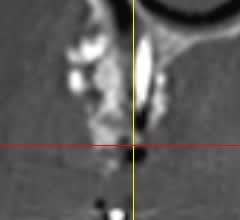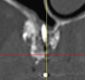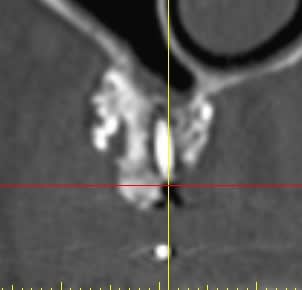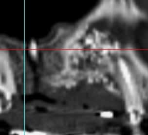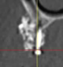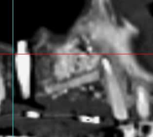 Il semblerait qu'il y ait eu , de plus, colonisation de la greffe d'une part via la vis qui transperce le sinus, et d'autres part part la dent adjacente ( image radio claire autour de cette dent).