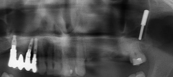 Premier forage en 27 puis foret de 3 mm, il a mis en place une tige témoin d'axe (elles ont un côté à 3 et un à 2 mm de diam mais pas de butée médiane), bref, la membrane était sûrement percée et il a vu soudain la tige aspirée dans le sinus (vraisemblablement lors d'une inspiration du patient et avec la membrane percée, la dépression créée a été fatale) et comme le patient était allongé, le guide c'est retrouvé calé sur la paroi post du sinus.