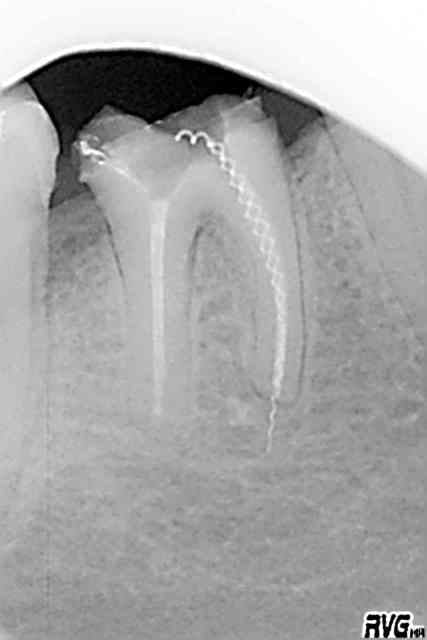 apres cavité d'acces et nogociation des canaux aux limes manuelles, les canaux ont été preparés avec le CMA, soudain, ploc, un bout de la lime NiTi est resté coincé dans le canal, 1/3 median
