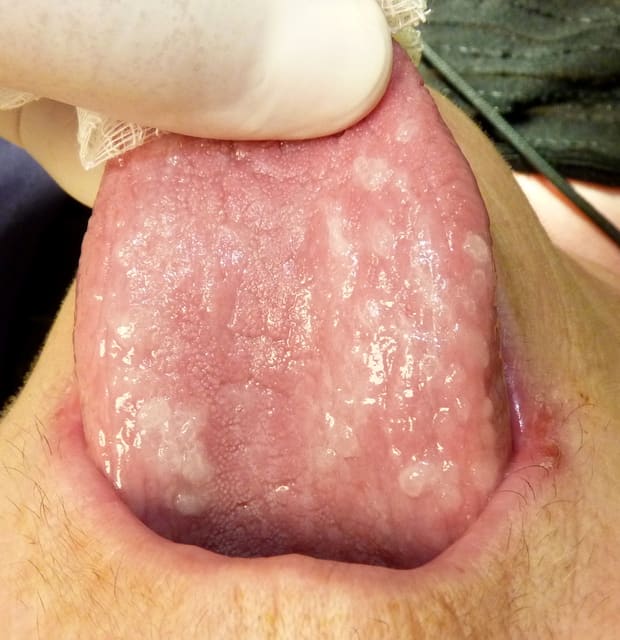 Elle présente alors des lésions sur le dos de la langue : à 1ère vue, j'ai pensé voir des vésicules. En regardant de plus prêt, ce sont des nodules de 2-3 mm blanchâtres, translucides, fermes, apparus depuis quelques semaines.