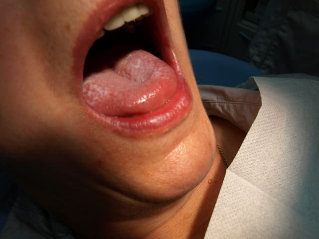> Elle présente alors des lésions sur le dos de la langue : à 1ère vue, j'ai pensé
